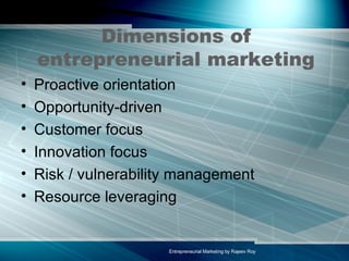 Entrepreneurial marketing relies more on direct interaction between customers and the brand with activities like personal selling and relationship marketing taking the forefront. Lets talk about marketing for a minute. Entrepreneurs however can take an interactive marketing approach driven by direct and personal contact with customers.